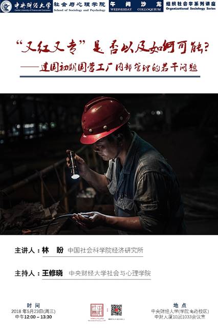 yl23455永利官网午间沙龙2018年春季学期第七期,暨“组织社会学系列讲座”第二讲,邀请到中国社会科学院经济研究所的林盼老师,与我们分享《“又红又专”是否以及如何可能?——建国初期国营工厂内部管理的若干问题》。欢迎各位老师、同学和朋友参加!